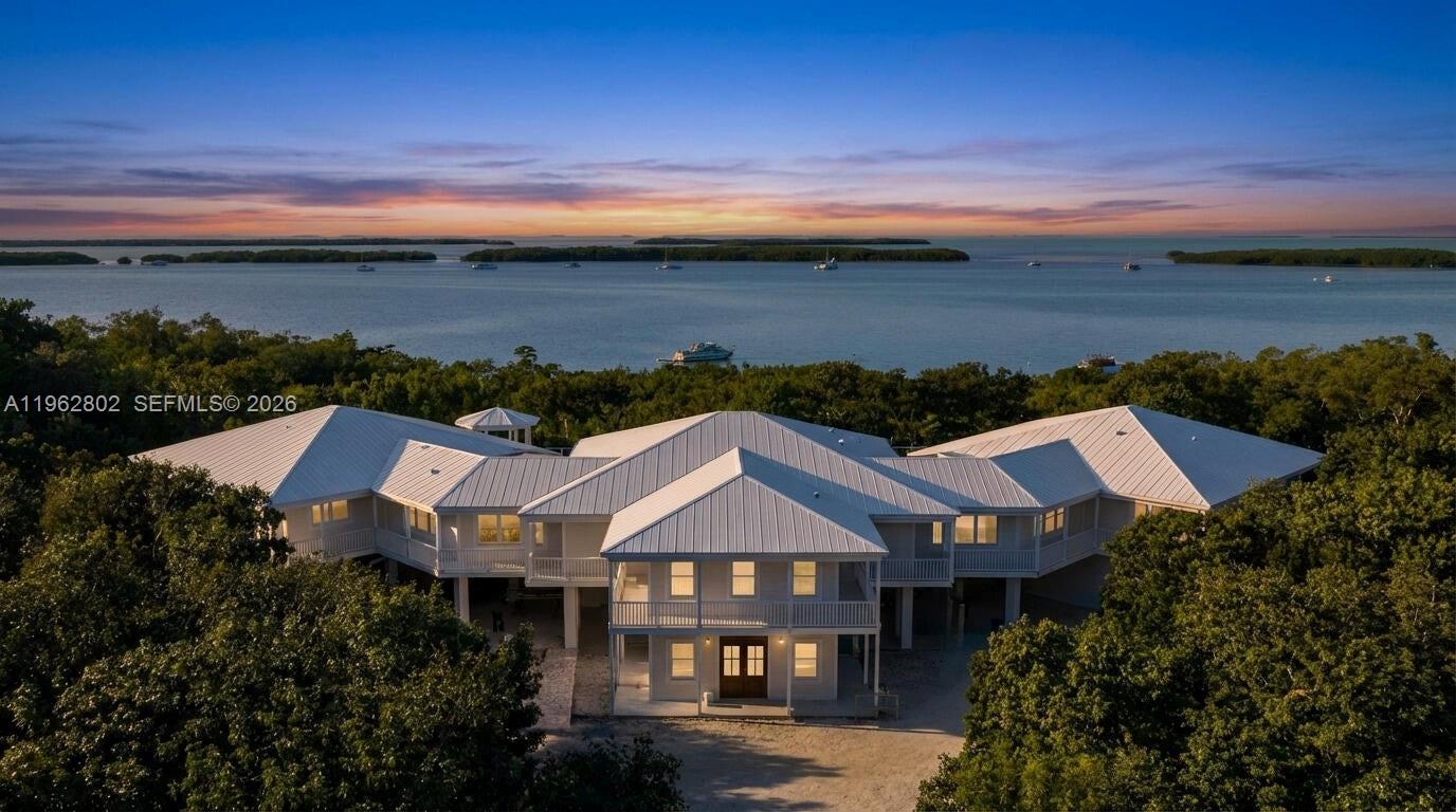 Introducing Isla House. A truly exceptional waterfront estate in the heart of downtown Islamorada, which exemplifies the serene beauty and elegance of Keys living. Set on a 5.82 acre double lot, Isla House overlooks 500+ feet of pristine Florida Bay waterfront. New custom construction melds traditional Caribbean architecture with clean modern aesthetics. The over 8,800 square feet of air conditioned living space is thoughtfully designed with bright open interiors which blend sophistication and comfort while framing breathtaking views of Florida Bay. You enter a sunlit two-story foyer leading you upstairs to a bespoke great room, encapsulating a dramatic vaulted wood ceiling, spacious living area, and a custom gourmet chef's kitchen. Floor to ceiling glass doors frame an unobstructed view of the spacious bay-view terrace, which features a 50 foot elevated infinity edge swimming pool and outdoor kitchen with bar. On the upstairs level you will also find a serene primary suite, five generous en-suite guest bedrooms, a powder room, and a large laundry room. The lower level offers a separate one bed en-suite with its own entrance and patio. A Media room with adjoining bathroom is the ideal flex space. A 1,600 square foot three car garage and a carport area completes the lower level. All told, there is nearly 25,000 square feet under roof cover. The estate's tropical grounds are designed to complement the home's architecture.